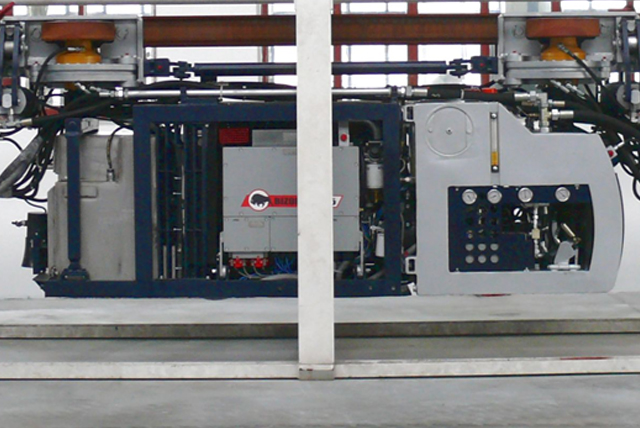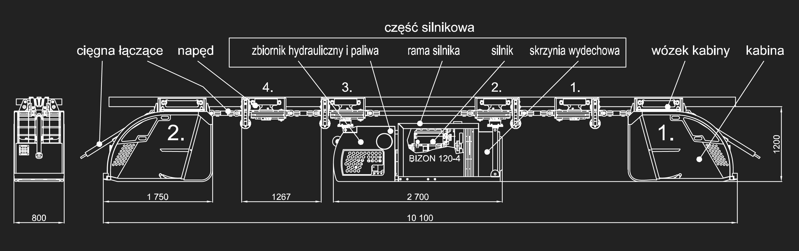 Lokomotywa podwieszana typu BIZON 120-X przeznaczona jest do transportu zestawów jezdnych (materiaÅ‚ów lub ludzi) po torze jednoszynowym podwieszanym I 155 w pÅ‚aszczyźnie poziomej oraz w nachyleniach do 30°.